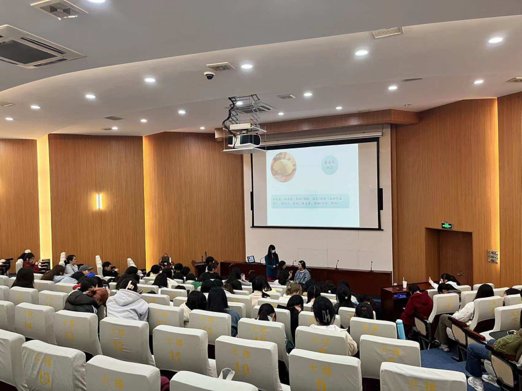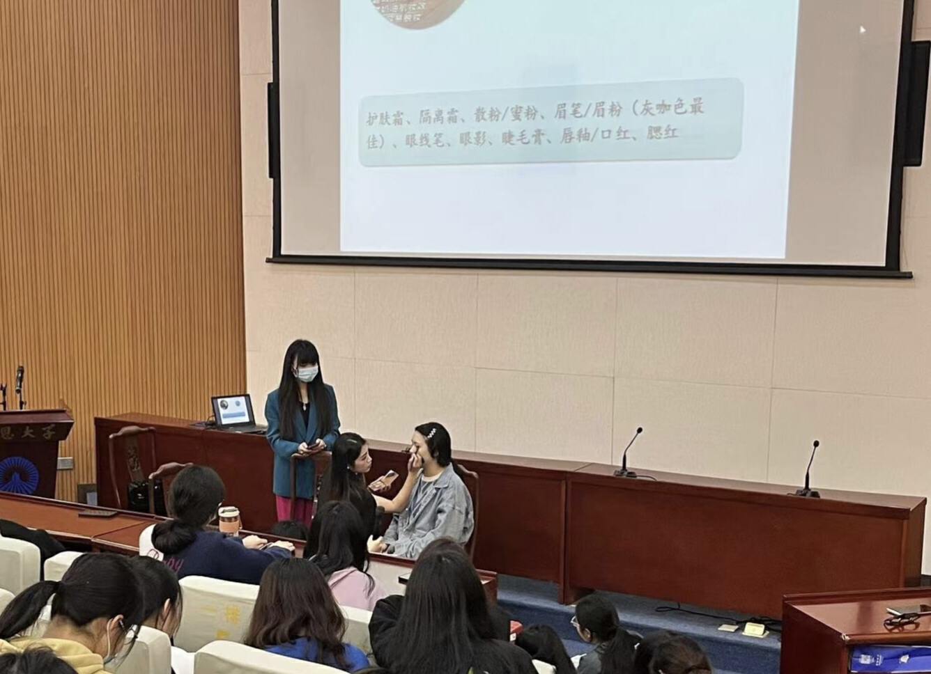 黄峰叶老师从2023年流行美学分析、美学解析和实操三个角度,结合专业知识,通过生动案例,为在座学员带来了许多化妆方面的干货。作为学生的我们该怎样化一个精致的日常妆容呢?该怎么样让自己变得更加美丽?她从基础面部护理、零基础化妆讲起,更是通过现场为自告奋勇的“模特”化妆,向学员们一一分享各种如常上班化妆小技巧。在老师的妙笔生花下,“模特”立马变得更加明艳动人、神采奕奕,使得下面的观众们都跃跃欲试,更是频频产生提问,询问自己日常的化妆护肤疑惑,现场气氛十分火热。