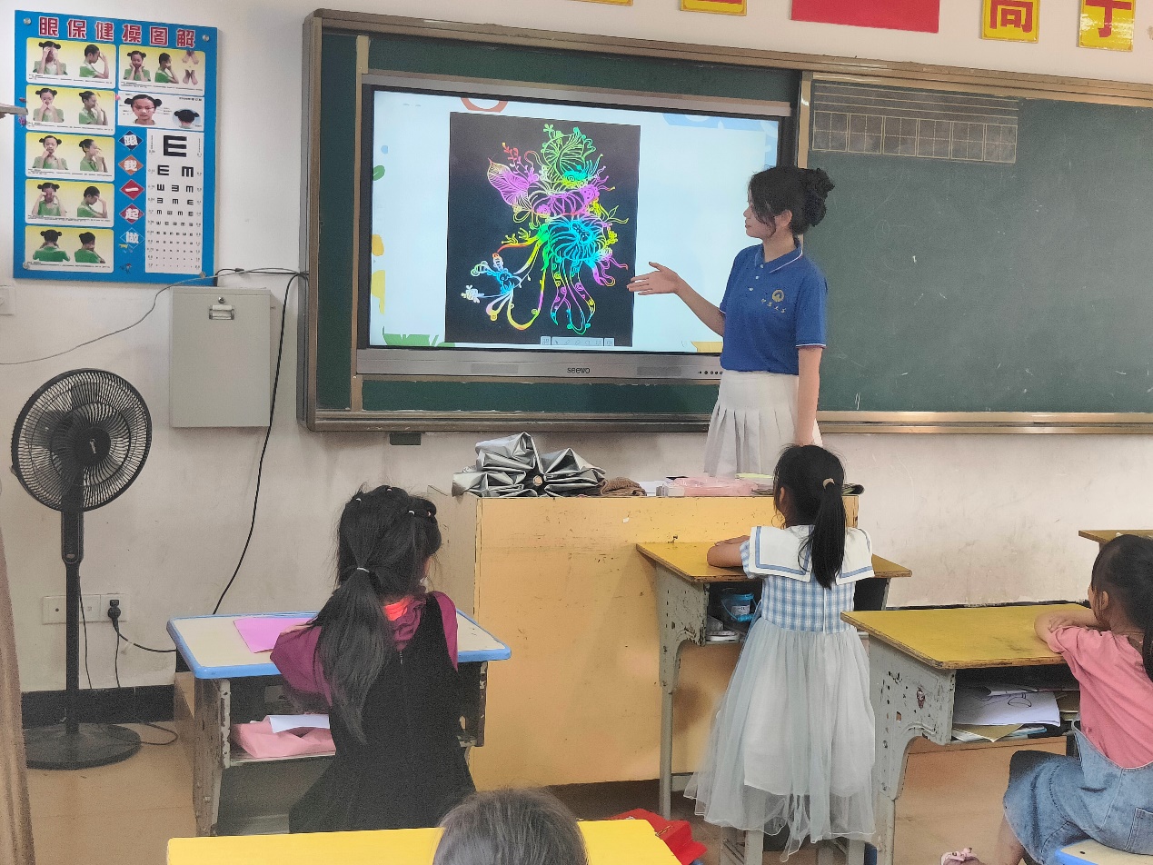 7月4日,实践队员依次开展语数英小三门以及艺术课程,在课间师生进行你画我猜游戏,游戏气氛欢快活跃,拉进了师生间的距离。学生陈梅婷说:“老师们很认真,早上王老师帮我解决了数学难题,下午老师们教我们折了爱心桃还画了荷花,我们玩的很开心也学了很多东西。”实践成员王婧柔感叹道:“这是我第一次教这么多小朋友,感觉挺辛苦的,但是看到小朋友们完成作品时候的笑容又觉得很满足,希望接下来的课程能够顺利进行。”