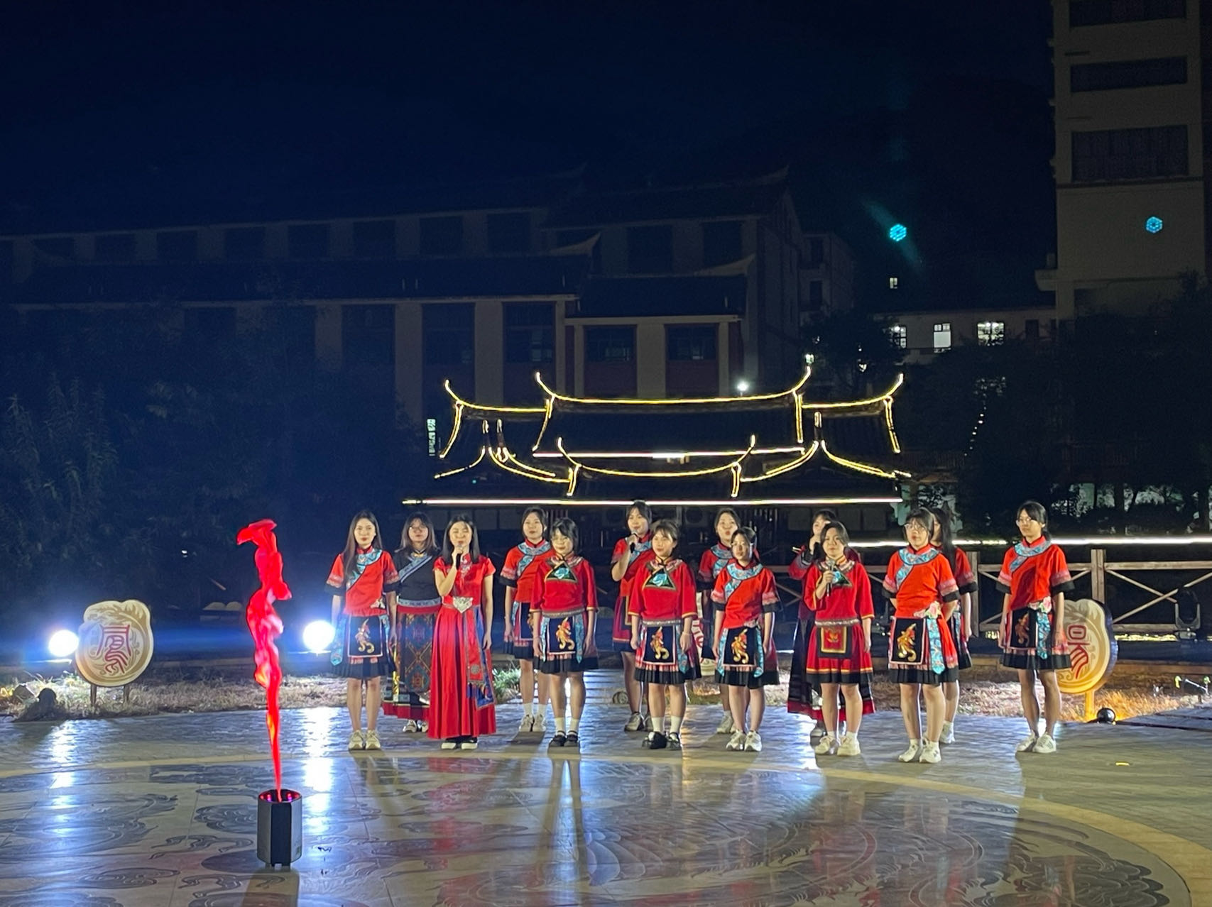 熊熊篝火耀月中,凝心聚力山水间。夜色配篝火,音乐配星辰,篝火晚会如期举行。本次的篝火晚会在欢快热烈的民俗舞蹈《祈福灵刀》中拉开帷幕,beat365英国官方网站“向阳新声”暑期实践队带来了合唱《萱草花》、《就让这大雨全都落下》两首作品,表达了对畲族乡以及畲族人民的喜爱。随着村民们和游客们一起围着火堆手拉手跳舞,晚会现场气氛瞬间被点燃。