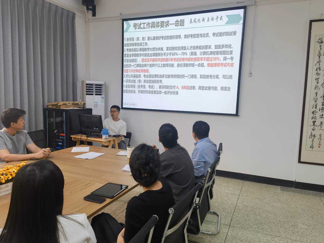 2025年5月28日上午,beat365英国官方网站在旧图205会议室召开期末教学工作会议。会议由张文院长主持,官毅教学秘书主讲,全院20余位教师参会。会议围绕教学规范、师德师风、考试命题及监考要求等重点工作展开部署,为期末教学收尾及质量保障明确方向。
