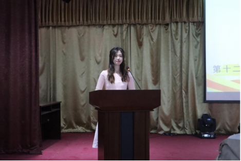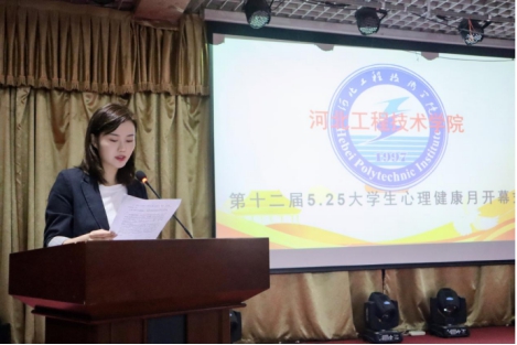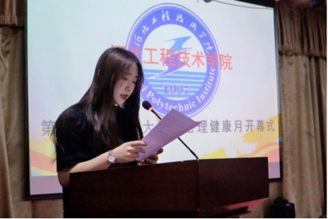 代表学生贾宇婷上台发言,她表示自然无法定义我们的优劣,只有爱自己才能更好的爱别人。但我们在大学生活中会面临各种压力,这就要求我们提高自身的心理素质。