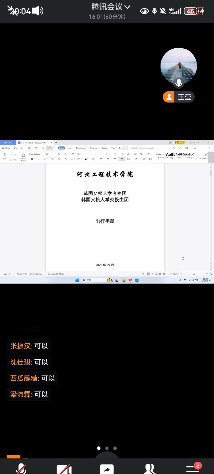 taptap4名学生将于近期赴韩国参加又松大学交换生项目。为做好出国交换学生行前工作、开展涉外安全教育,9月5日晚上20:00-21:00,大学外语教学部(国际交流学院)通过腾讯会议举行行前培训会,大学外语教学部(国际交流学院)副部长王莹、艺术与传媒学院副院长张会改、人工智能与大数据学院办公室主任田亚雷、艺术与传媒学院视觉传达设计专业辅导员王珺、人工智能与大数据学院人工智能专业辅导员王凤、教学秘书张杰雄以及学生和家长代表参会。会议由大学外语教学部(国际交流学院)教学秘书张杰雄主持。