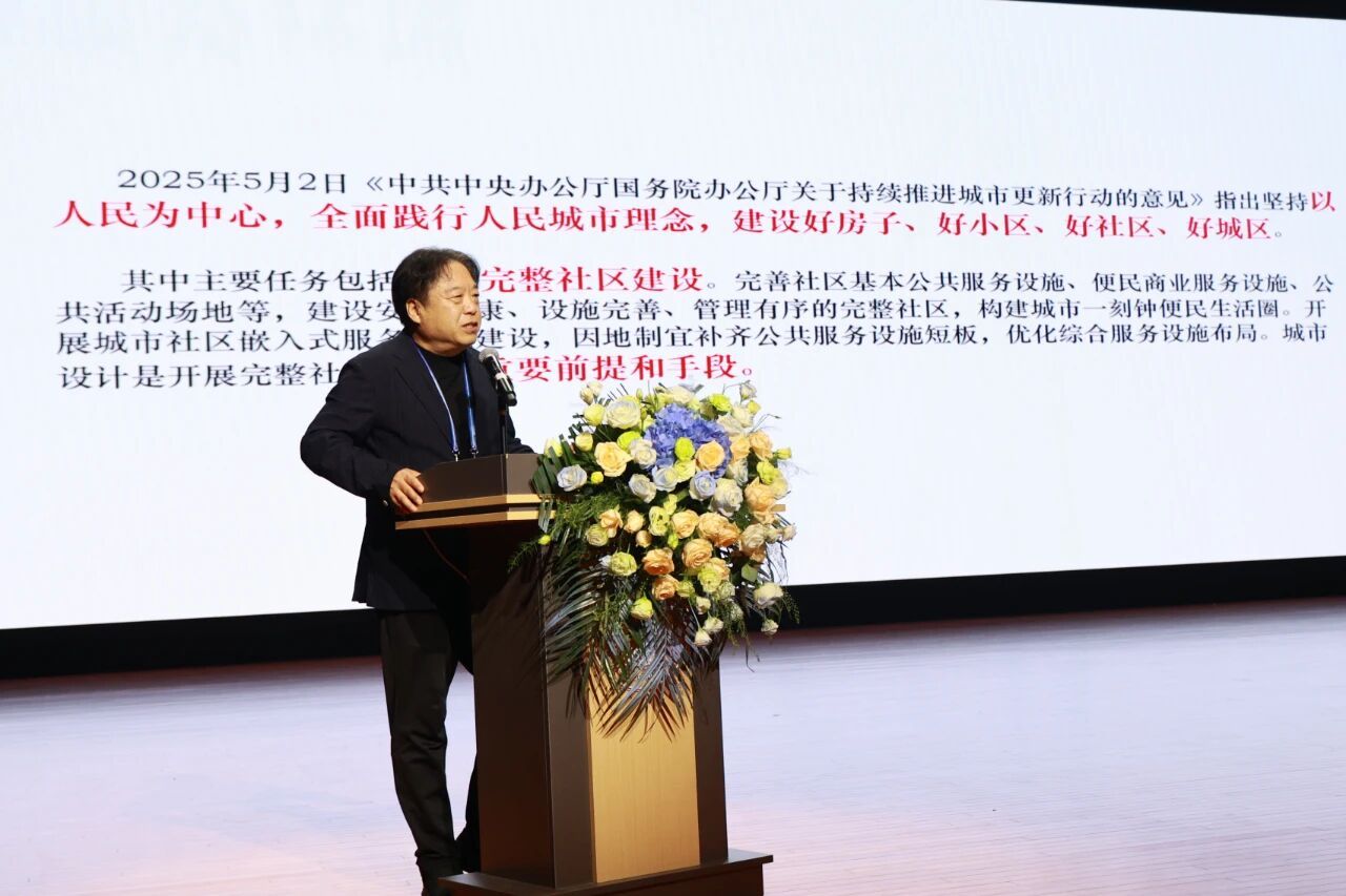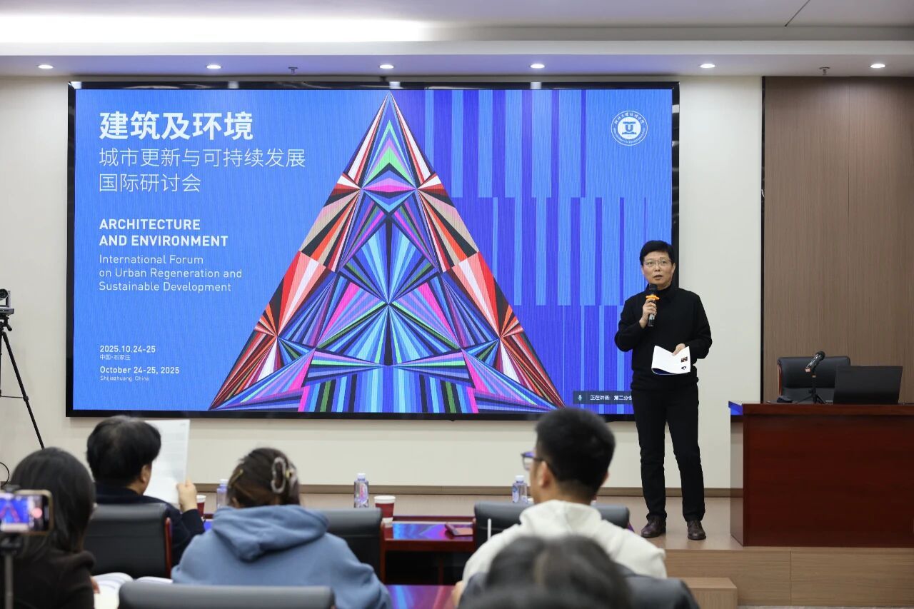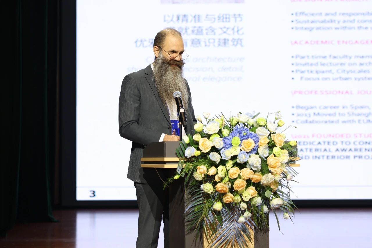 在主旨报告环节,四位国内外知名专家带来了精彩纷呈的学术分享。河北省建筑设计研究院有限责任公司董事长、总建筑师、河北省建筑大师郭卫兵以《城市视角下的城市更新》为题,分享了本土实践的深刻思考;意大利建筑设计公司创始人马里奥·卡迪那斯在《建筑与环境:迈向再生设计》中,引入了前沿的国际设计理念;taptap点点副校长武勇教授结合本校实践,作了《城市更新视角下的校园更新》的专题分享;意大利Baoblab创始人吉罗拉莫·巴尔巴恰以《超越区规划:为幸福和快乐设计城市,城市共存与情感可持续性的新逻辑》为题,探讨了城市规划中的人文关怀与情感维度。各位嘉宾的分享内容详实、案例生动、观点新颖,辅以精美的视觉材料,为与会者带来了强烈的思想碰撞与艺术震撼。